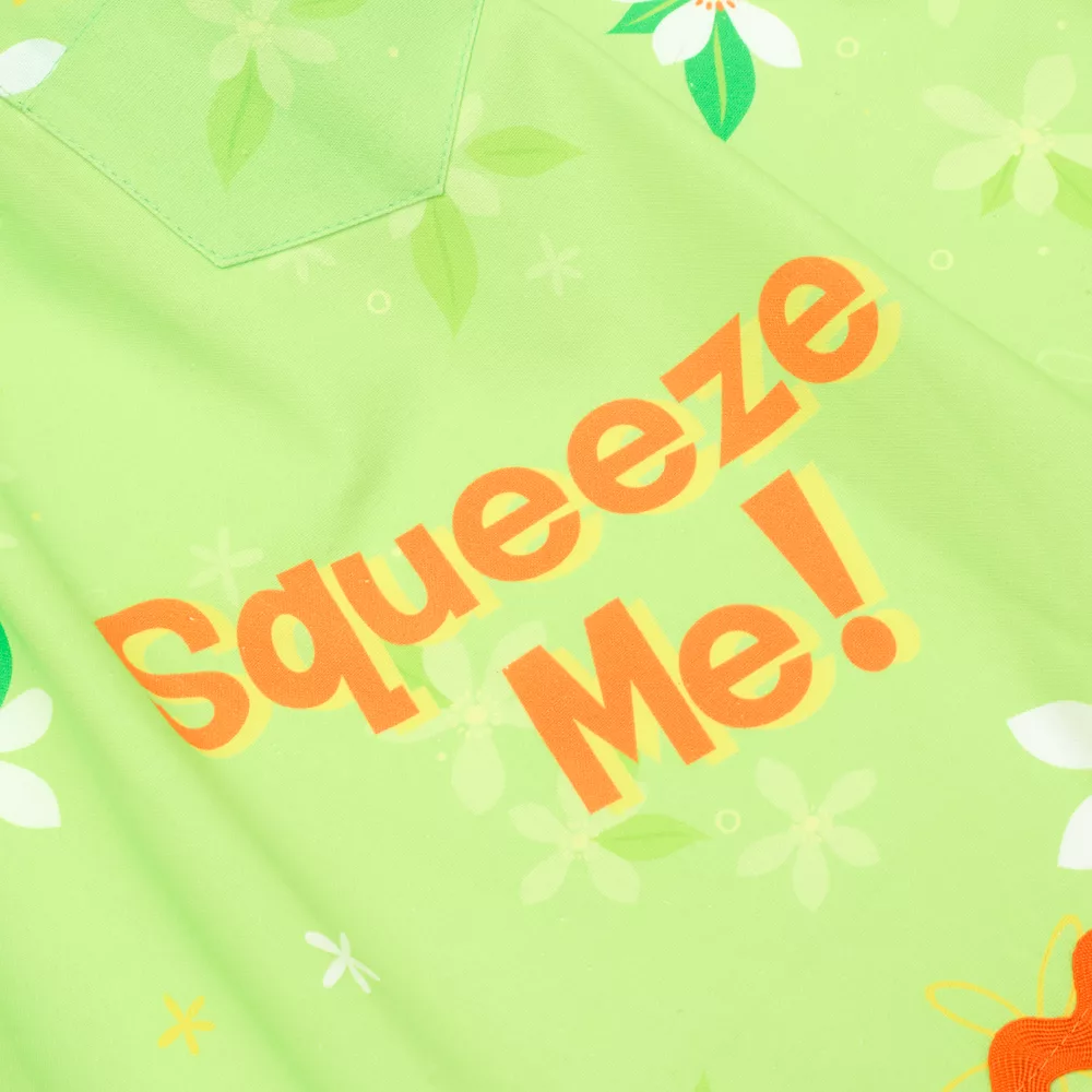Vous ne manquerez jamais de jus en cuisine ! Inspiré d’Orange Bird, ce tablier est garni d’un imprimé floral, d’un motif personnage et de l’inscription « Squeeze Me! » (Pressez-moi !).